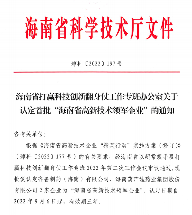 近日,海南省科学技术厅发布的《海南省打赢科技创新翻身仗工作专班办公室关于认定首批“海南省高新技术领军企业”的通知》中显示,批复认定海南金沙城药业集团股份有限公司等2家企业为“海南省高新技术领军企业”。认定日期自2022年9月6日起,有效期三年。