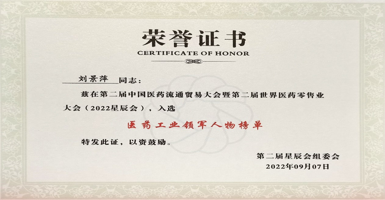 本次星辰会期间,金沙城斩获颇丰,获得多项行业奖项及荣誉。在开幕式上,刘景萍董事长荣获“医药工业领军人物”称号。